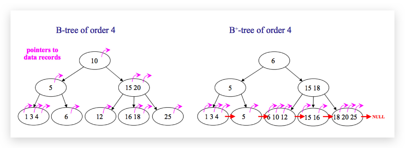 - B-树在提高了磁盘IO性能的同时并没有解决元素遍历的效率低下的问题。B+树的叶子节点使用指针顺序连接在一起,只要遍历叶子节点就可以实现整棵树的遍历。而且在数据库中基于范围的查询是非常频繁的,而B树不支持这样的操作。