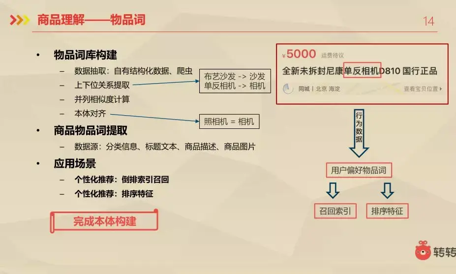 先是物品词库的构建,不断地挖掘当前都有哪些东西,以及以后还打算做哪些东西。这部分的数据大部分是从我们自有的结构化数据那里拿到的,也有一部分是从外部爬去得到的,还有是从命名实体识别得到的。