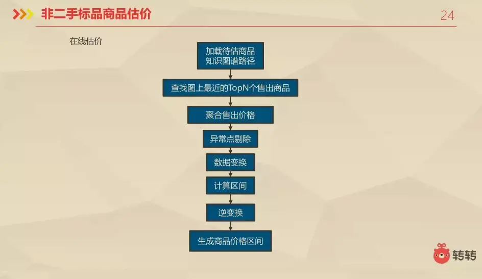 上面仅仅说了二手标品ID的估价,这里还有非二手标品商品估计。手机很好说,但是衣服的话,从一手状态就不太好标品化,这有一套另外的解决方案,首先还是基于知识图谱制作,查找图谱中最近的TopN个出售商品,在聚合出售的价格,删除异常点,进行数据变化,计算价格区间,最后进行逆变换,生成商品价格区间。