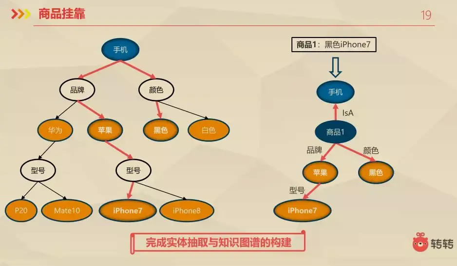 这还是刚才的例子,商品挂靠之后生成一个实体(右侧)这一块做完之后完成实体的抽取与知识图谱的构建。目前我们有一些关于知识推理和知识图谱的应用,优先级并不是这样的,目前还没有发力去做。