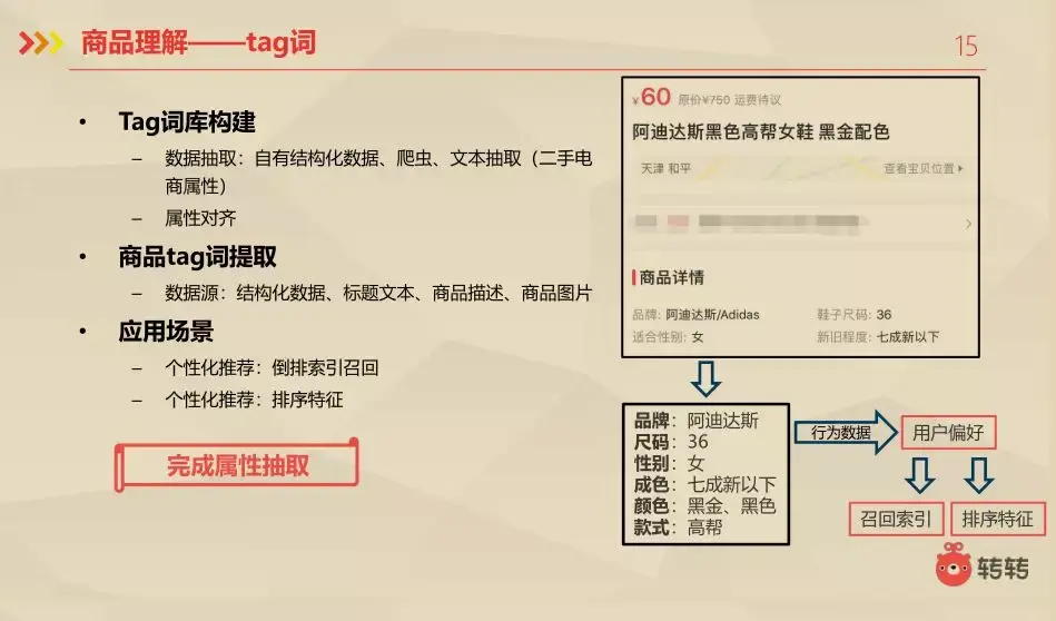 后面做了一个商品理解的Tag词,这是物品词的演进,这是服务的升级,刚才我们提取到的是用户感兴趣的东西,但是人往往不会局限于对这个东西感兴趣,还有可能对这类物品有很多的要求。所以需要从属性的角度去挖掘用户的兴趣,比如右下角的例子。对该商品提取出更多的属性。那这个套路和刚才的物品词比较相似。这里需要注意的是,一手化的数据可以从自有结构的数据,爬虫,文本抽取中可以拿到,但是二手数据只能从文本挖掘中抽取。还有属性对齐。还有商品Tag词的提取,他的数据源来源于结构化数据,标题文本,商品描述,商品图片等。应用场景和物品词一致。最后就完成了属性抽取。