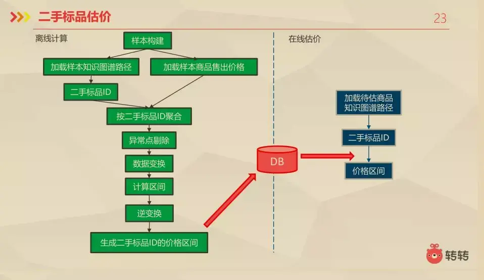 这块就是整个流程,前面要进行样本构建,然后在加载样本知识图谱和样本商品售出价格,在开始离线计算二手标品商品ID的价格区间。由于我们也没有二手商品的真正的价格,所以这里需要另外一个假设,我们认为大部分成交的二手商品的成交价是合理的,因为这是买家和卖家讨价还价之后的结果,并且基本上满足了双方的心理预期。所以我们收集已成交商品的价格,在按照二手标品ID聚合,对异常点删除,在进行数据变化。计算价格区间。最后生成二手标品ID的价格区间放到数据库中,在线估价的时候,首先加载待估计商品知识谱图路径,然后定位二手标品ID,最后确定价格区间。
