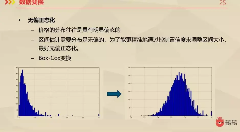 对于价格来说,他的分布有明显偏态的,但是区间估计需要分布是无偏的,为了能更精准地通过控制置信度来调整区间大小,最好无偏正态化。类似于左下角的分布,拿对数变换或者平方根变换就可以变换成近似正态分布,但实际数据的情况会复杂多样一些,为了能很好得无偏正态化,我们采用Box-Cox变换。对数变换和平方根变换是其特例。