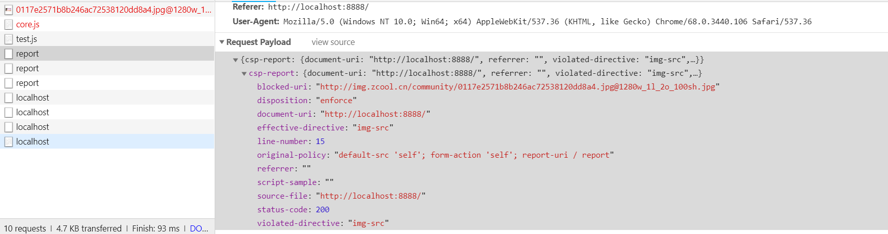 network查看,发送的内容,是 标准的 csp report 的内容。