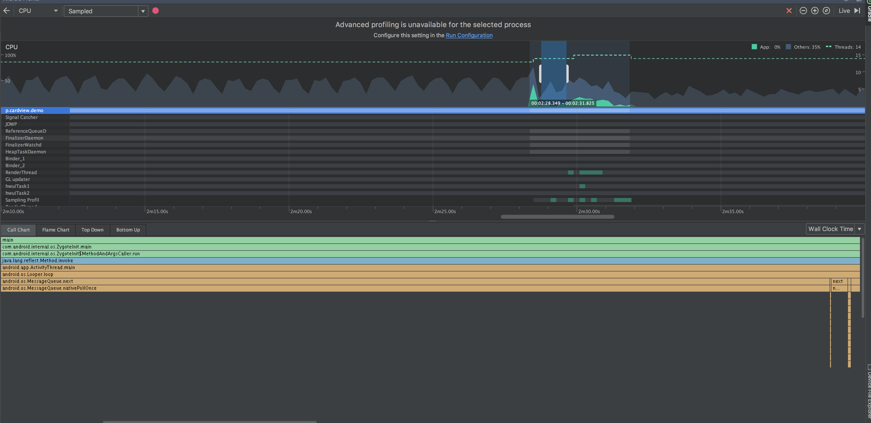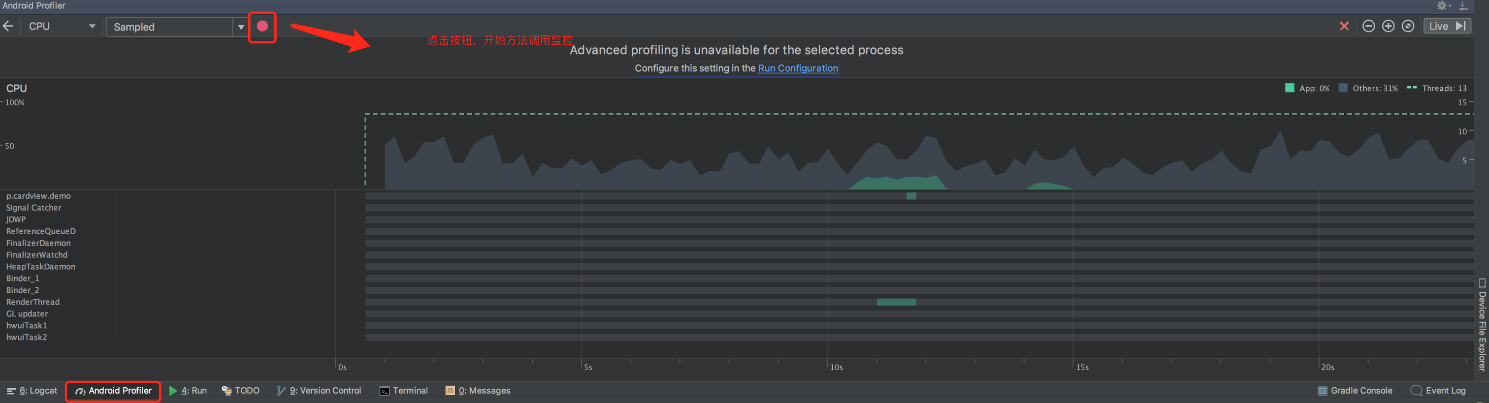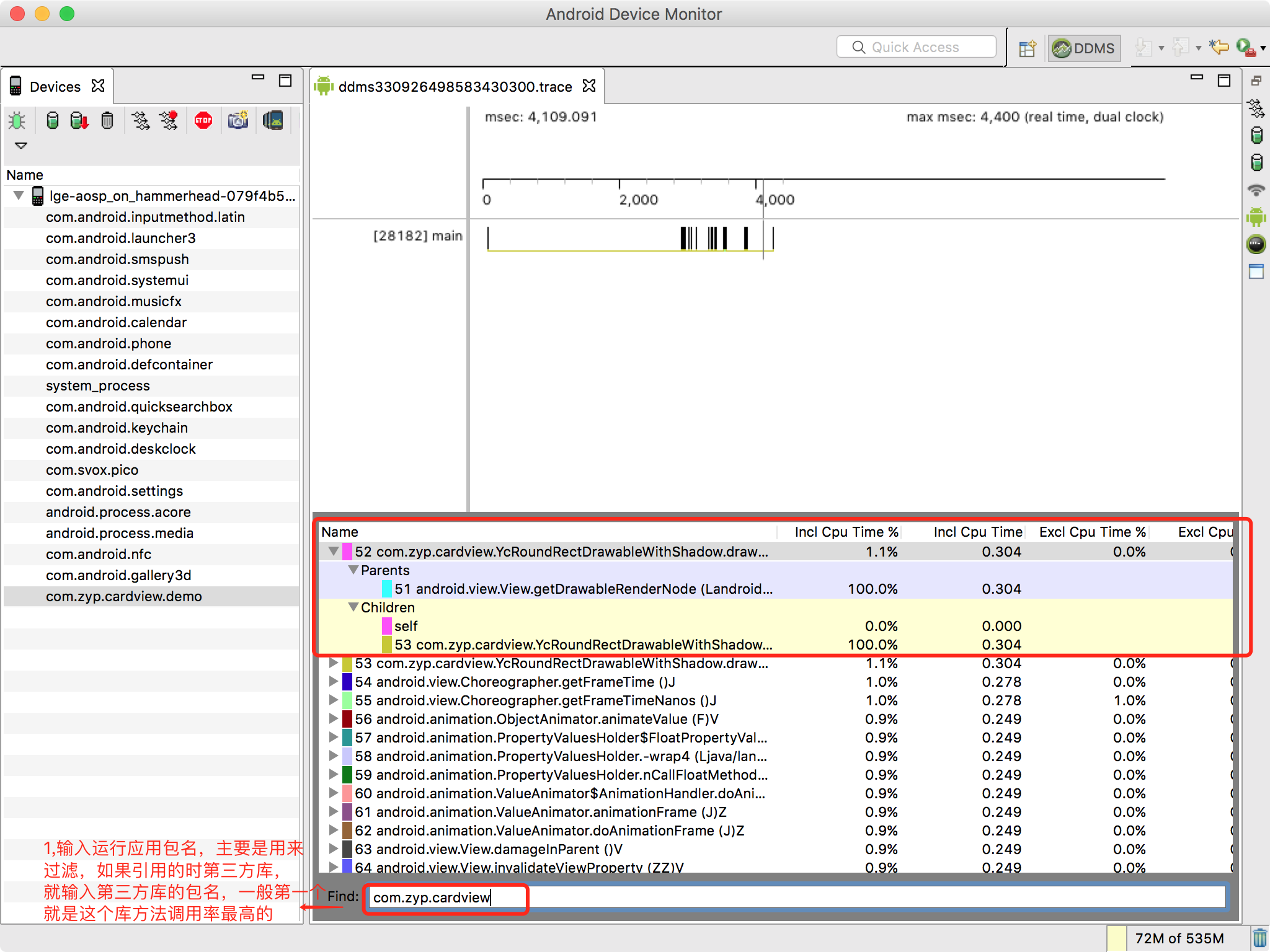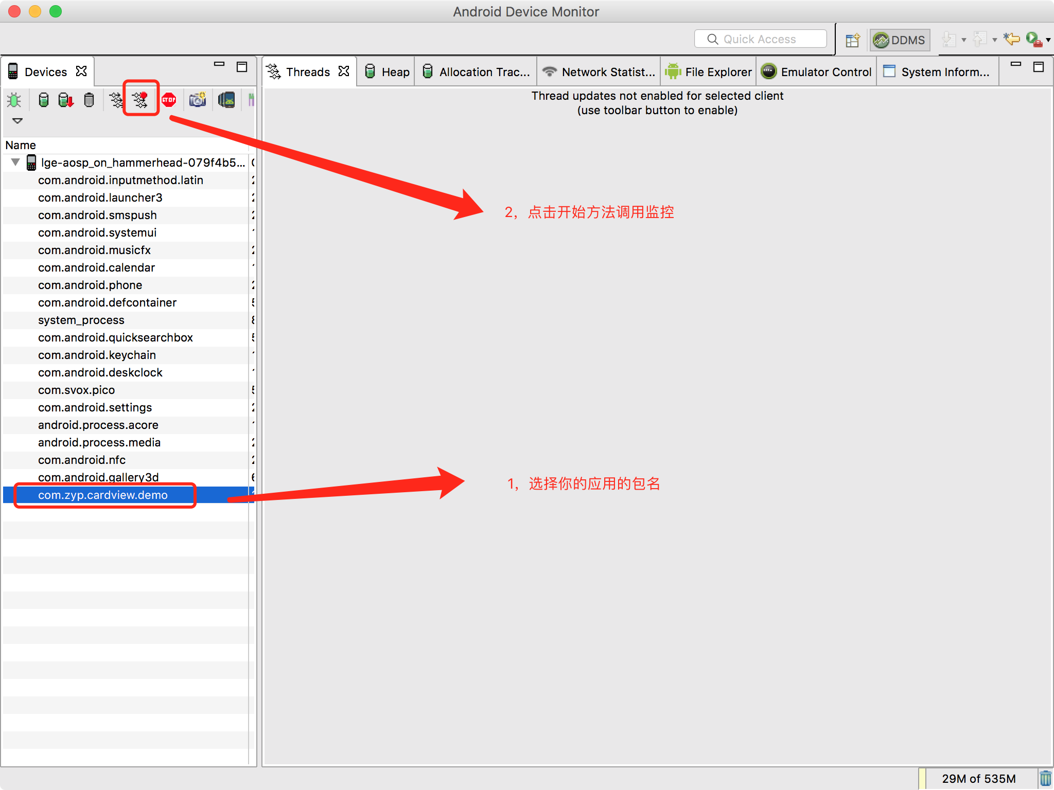 - 在引用第三方的UI库,特别是View绘制相关的,如果View本身没有变化,draw()方法却一直执行,这种问题就非常严重了,但是这种问题却是最好排查的,Android Studio自带的工具Android Device Monitor就可以轻松实现排查,如下图: