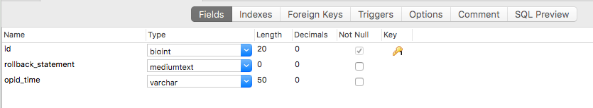 opid_time varchar(50): 这个列存储的是的被执行的 SQL 语句在执行时的一个序列号,这个序列号由三部分组成:timestamp(int 值,是语句被执行的时间点) + 线上服务器执行时所产生的 thread_id + 当前这条语句在所有被执行的语句块中的一个序号组成。可见上面的结果:**1533716166_25519001_1**, 这个序列号同时也会出现在执行返回的结果中,所有需要回滚就是根据这个序列号去备份表中查询回滚的 SQL 语句。