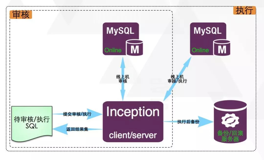 Inception 的架构图如下图所示,简单来说,Inception 就是一个 MySQL 的代理,能够帮助你审核 SQL,执行 SQL,备份 SQL 影响的记录。Inception 是一个 C/S 的软件架构。我们可以通过原生的 MySQL 客户端 去连接,也可以通过远程的接口去连接,目前执行只支持通过C/C++接口、Python接口来对Inception访问。
