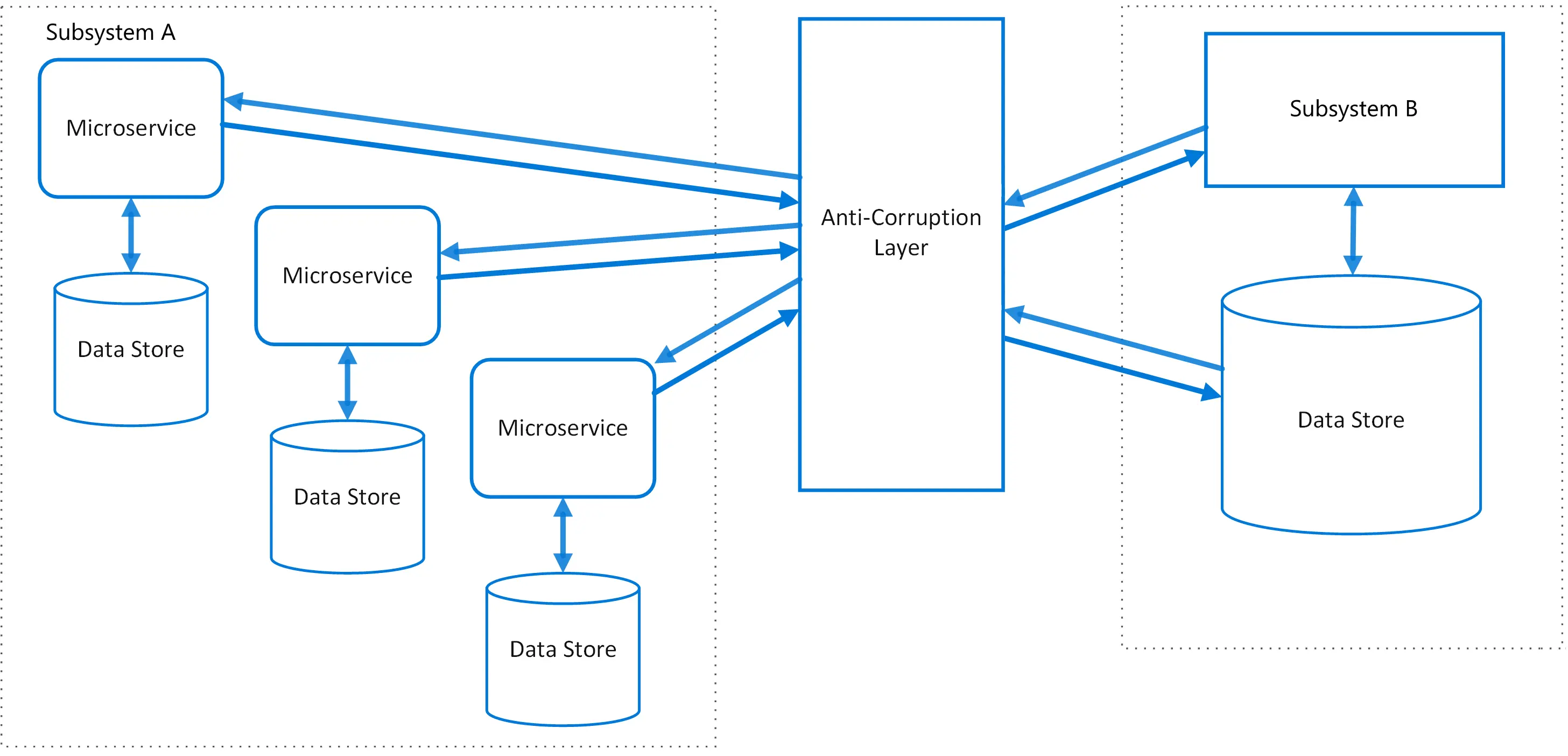 使用一层防腐层来作为新老系统通讯的中间人。这样新系统可以完全使用新的通讯方式和架构方式,老的系统又不用进行特别改造可以暂时保留,等老系统不用之后可以废弃这个反腐层。这种模式适合新老系统迁移的过渡方案,不属于永久使用的架构设计模式。