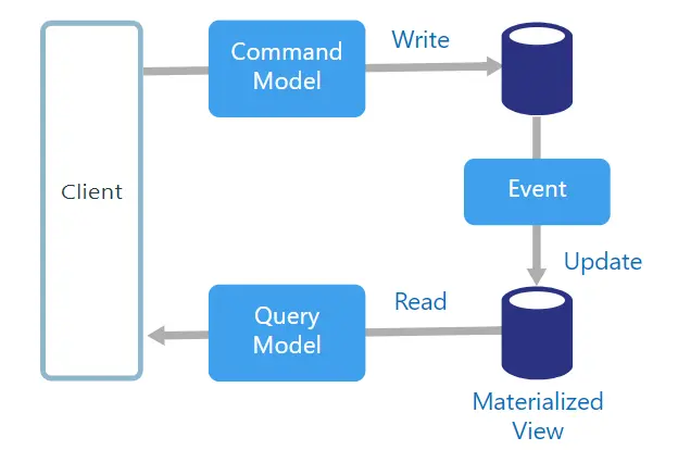 现在一般的做法是类似于上图的做法,为读写配置两套独立的数据源,并且和事件溯源的方式结合起来做(见后面一节)。我们来说说读写两套模型在存储上分离这个事情,在《相辅相成的存储五件套》一文中我们的架构图其实就有这方面的意思。对于读写这两个事情,我们完全可以不用一套数据源,为读建立专门的物化视图,可以针对读进行优化,避免在读的时候做很多Join的工作,可以把性能做到极致(后面会有物化视图模式的介绍)。事件溯源+CQRS+物化视图三者一般会结合起来使用。