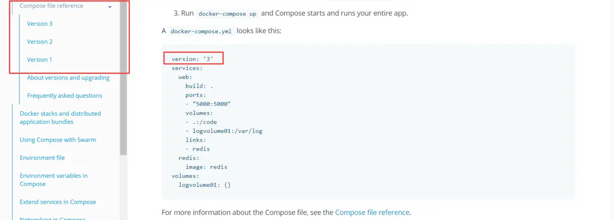docs.docker.com/compose/ove… ,version版本统一用3,其实3是兼容2的,version版本1 就不要考虑了已经废弃了,一定要往前看。3和2的最大区别是3比2强大,好像是废话,3支持多机和单机,2仅支持单机。