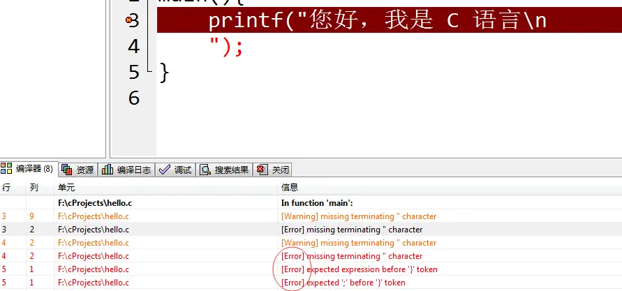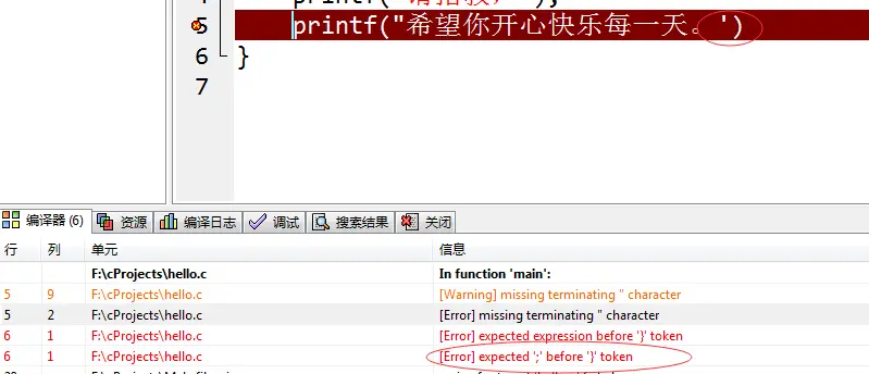 如果省略 printf 后面的分号,那么就会出现编译错误: