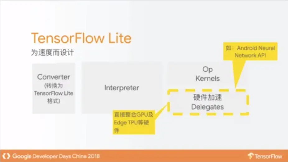 此外TensorFlow Lite还紧密整合硬件加速器,支持如下几类硬件加速器: