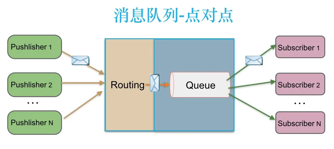 - 点对点:生产端发送一条消息通过路由投递到Queue,只有一个消费者能消费到。