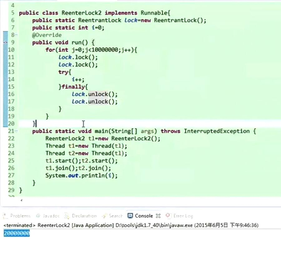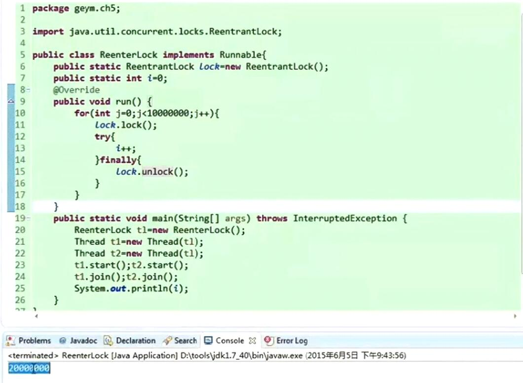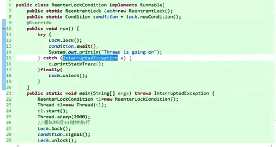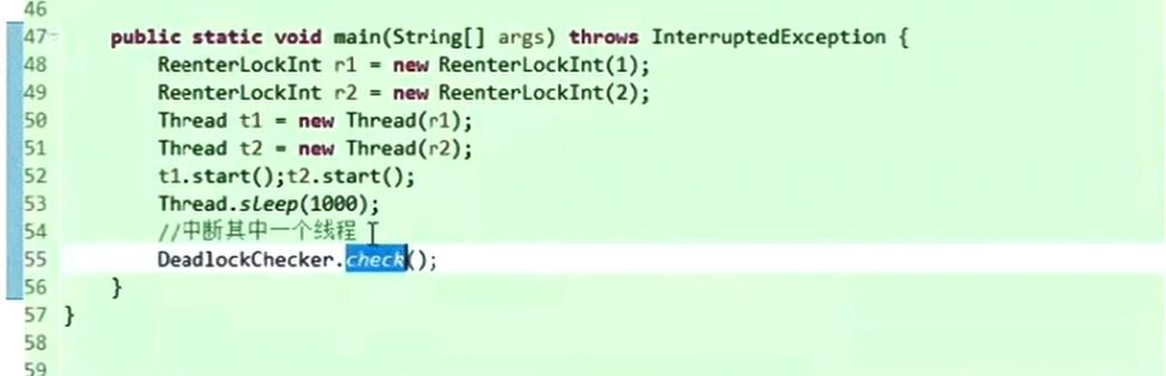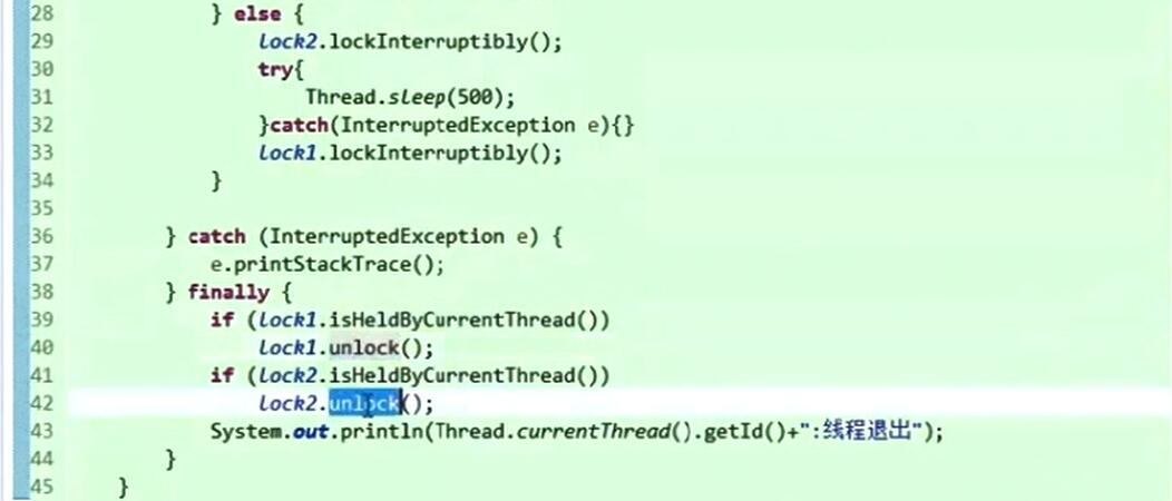 第23行的 lock1.lockInterruptably(); 这个方法加锁, 表示这个锁可以中断,中断后就抛出异常