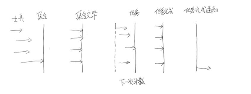 主线程到达临界点等待其它线程,等其它线程完成自己的工作后,主线程才继续执行。