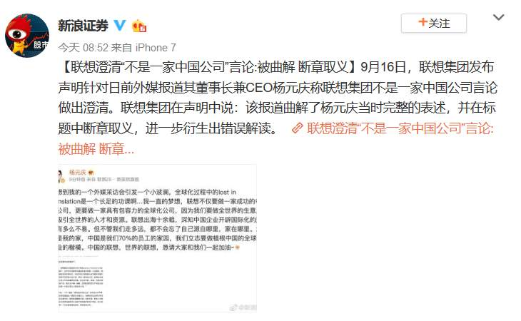 【联想集团在16日发布声明澄清,表示该报道曲解了杨元庆当时完整的表述,并在标题中断章取义,进一步衍生出错误解读。事情起源于英国《问询报》14日的一篇采访。报道使用了“联想CEO:我们不是一家中国公司”的标题,可谓分外刺眼。