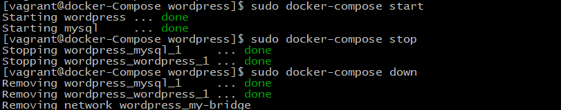 - stop 停止 start启动 down=stop+remove