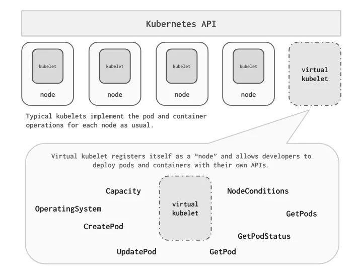 微软的Virtual Kubelet项目是最值得关注的利用Kubernetes的调度器。Virtual Kubelet是在外部环境中运行的代理,被注册为Kubernetes集群中的一个节点。该代理通过Kubernetes API创建节点资源。它用到了污点(taints)和容忍(tolerations)这些概念,通过调用原生API来调度外部环境中的pod。