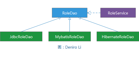 业务层通过 DAO 接口来访问数据,这样就实现了业务层与 DAO 层具体持久化技术之间的解耦,比如下图中的 RoleService 通过 RoleDao 接口来访问角色数据对象: