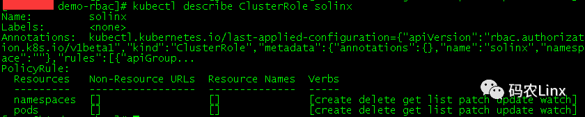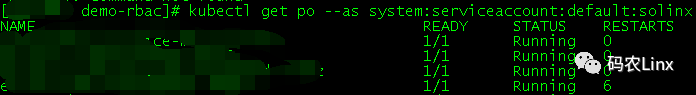 上面定义了一个服务账户solinx、普通角色solinx,并将该服务账户与角色进行绑定,该角色定义了对了pod的增删查改等操作,所以该服务账户也具备了该权限; 这里使用solinx服务账户对资源进行操作: