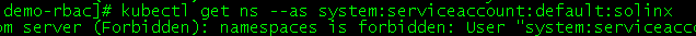 kubectl get ns --as system:serviceaccount:default:solinx Error from server (Forbidden): namespaces is forbidden: User "system:serviceaccount:default:solinx" cannot list namespaces at the cluster scope