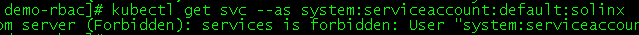 kubectl get svc --as system:serviceaccount:default:solinx Error from server (Forbidden): services is forbidden: User "system:serviceaccount:default:solinx" cannot list services in the namespace "default"