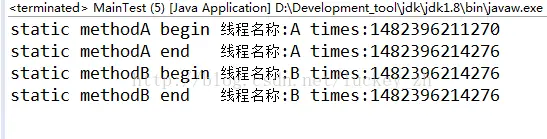 System.out.println("static methodA begin 线程名称:"+Thread.currentThread().getName()+" times:"+System.currentTimeMillis());