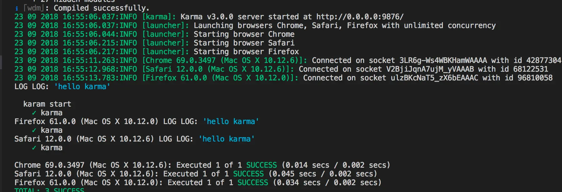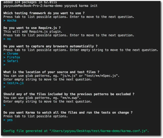 对于前端而言,javaScript 和 node 就够了。所以mocha 测试框架就够了。同时mocha也可以运行在浏览器上。对于mocha 而言,需要配置html,才能运行在各个浏览器上。配置mocha 相对复杂,繁琐一点,所以我们选择框架是karma + mocha;