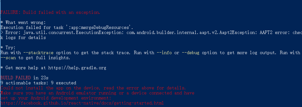 在项目根目录下的gradle.properties文件(如果没有,新建)中添加以下配置: android.enableAapt2=false 清理项目,重新编译,问题解决