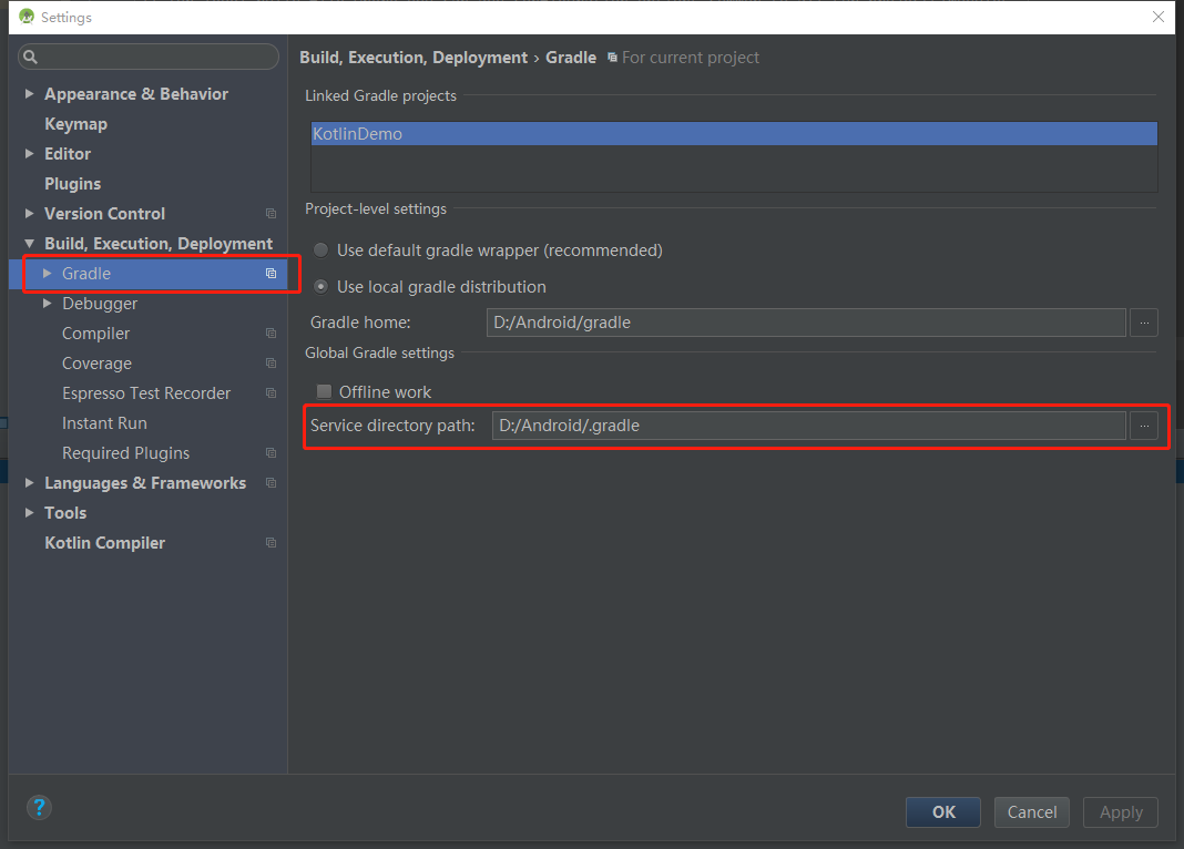 方案二:修改Gradle用户目录(推荐) Android Studio中菜单栏,File->Settings,打开Gradle标签,修改Service directory path,将这个目录指定到一个没有中文目录的文件夹中,清理项目,重新编译,问题解决。