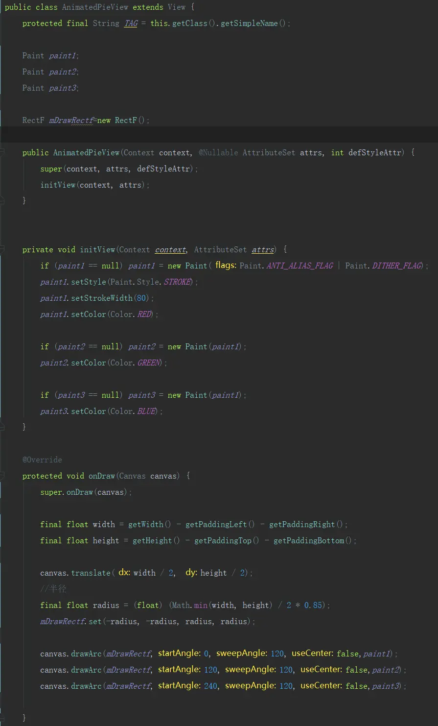 在绘制的时候,我们把用户传入的数据存到一个List中,在存入的时候,根据获取的value进行计算,得到其开始角度和结束角度,并把数据包装在一个类里面供控件内部使用。而这一切,对外部来说都是不透明的,外部使用仅仅关注的是配置,而不是计算。