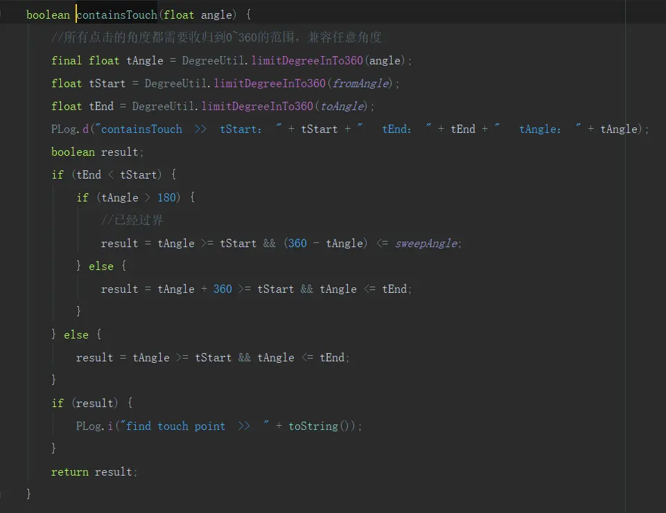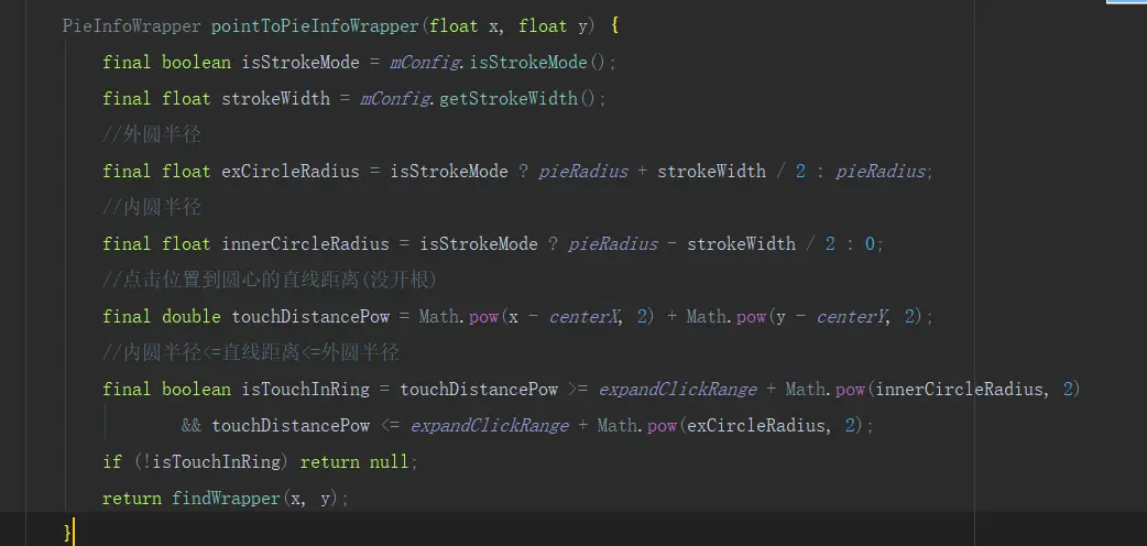 我们获取触摸点的x,y,计算其到中心的距离,假如当前是甜甜圈模式(环形饼图),则需要甜甜圈内径≤距离≤甜甜圈外径则判定在甜甜圈内。