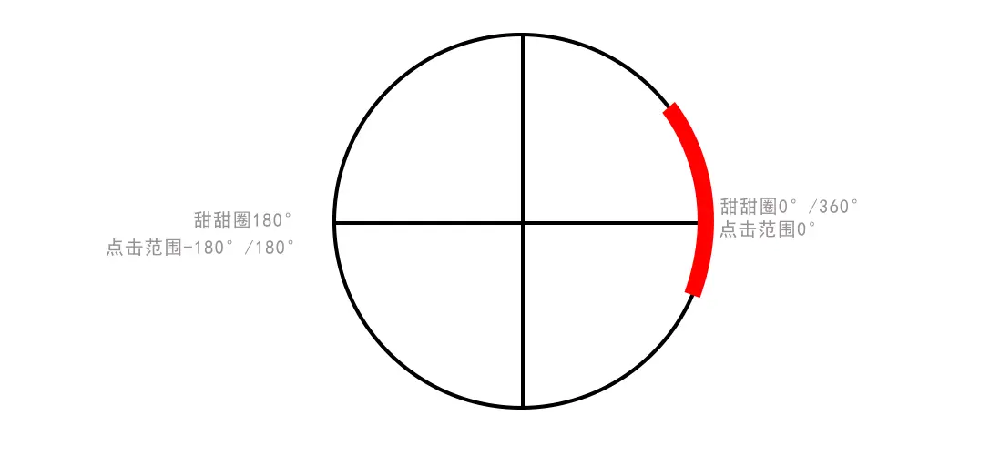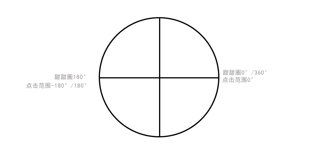 这个问题很简单,因为我们的甜甜圈在转换为0 ~ 360°之后,在1、2象限表现的是180° ~ 360°的范围,而我们点击的角度在1、2象限是-180° ~ 0,如果加上180,则是0 ~ 180°,还是无法满足我们的甜甜圈判断,因此在数值小于0的情况下,我们加上360°。