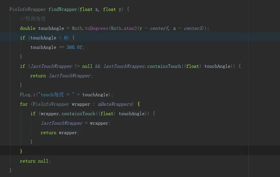 计算完距离后,我们需要计算角度,我们通过角度来获取我们当前点击的是哪一段的甜甜圈。