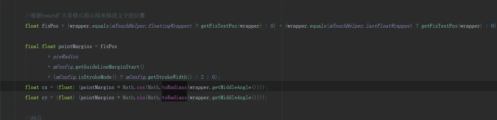 那我们需要怎么做呢?实际上这也是三角函数的简单运用,根据效果图,文字指引线的起始点是在甜甜圈的中间,因此我们可以根据甜甜圈的中心点到某段甜甜圈的中间连线作为三角形的斜边,根据三角函数sin/cos求出x,y的坐标即可。