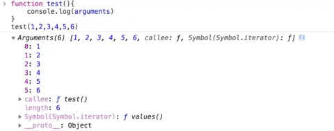 我们发现arguments的__proto__是Object,证明了arguments是个对象类型,并不是数组。它的属性名是按照传入参数的序列来的,第1个参数的属性名是"0",第2个参数的属性名是"1",以此类推,属性名类似数组中的索引值。