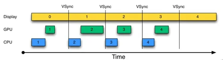 VSYNC 类似时钟中断。每次收到 VSYNC 中断,CPU 会立即准备 Buffer 数据,业内标准刷新频率是 60Hz(每秒刷新 60次),也就是一帧数据的准备时间要在 16ms 内完成。