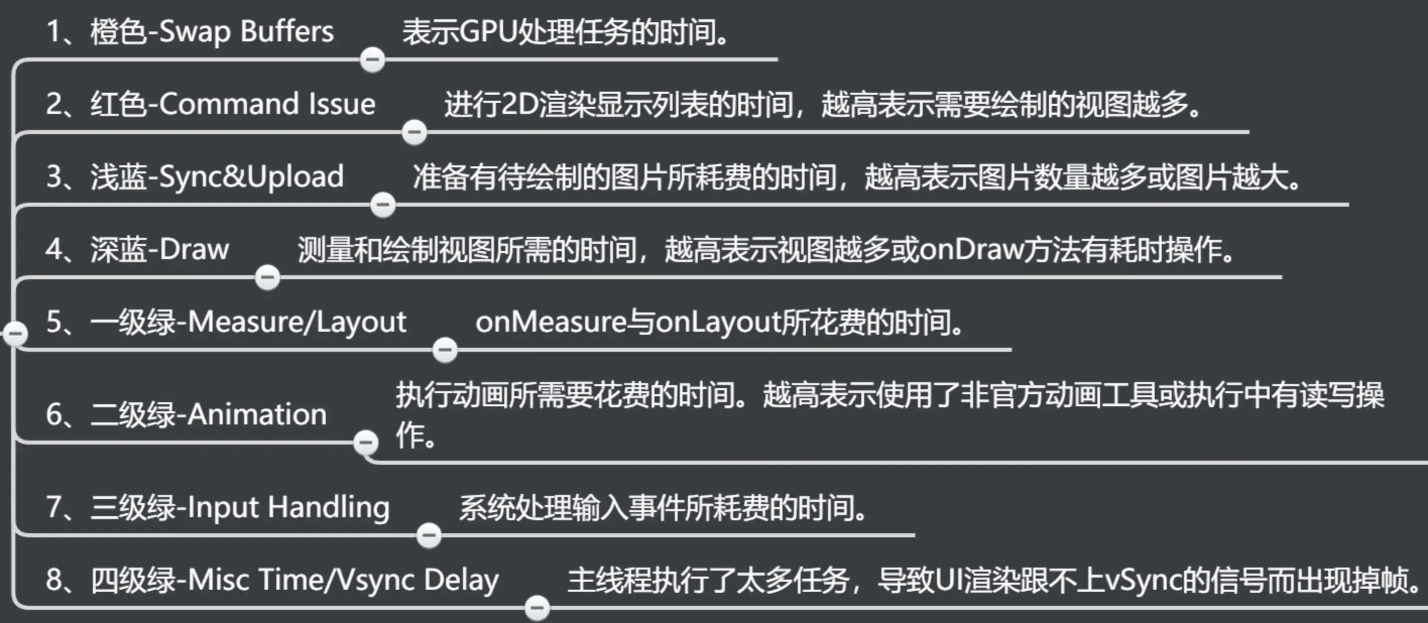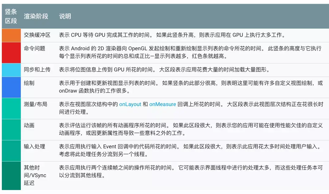 Systrace,Android 4.1 新增的新能数据采样和分析工具。 Tracer for OpenGL ES,Android 4.1 新增的工具,可以逐帧、逐函数的记录 App 用 OpenGL ES 的绘制过程。 过度绘制工具,Android 4.2 新增,参考《检查 GPU 渲染速度和绘制过度》