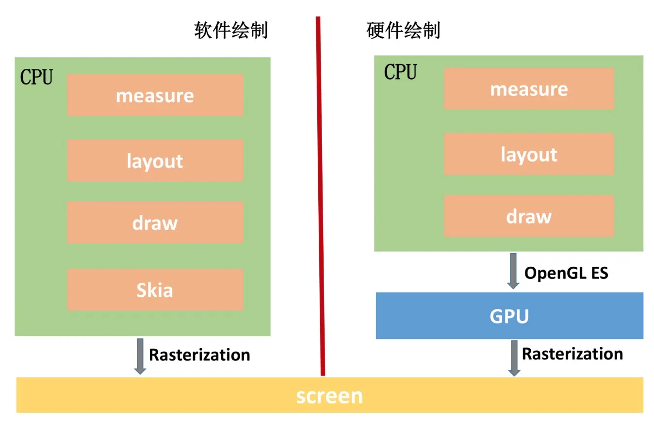 UI 渲染还依赖两个核心的硬件:CPU 和 GPU。UI 组件在绘制到屏幕之前,都需要经过 Rasterization(栅格化)操作,这是一个耗时操作,而 GPU 可以加快栅格化。