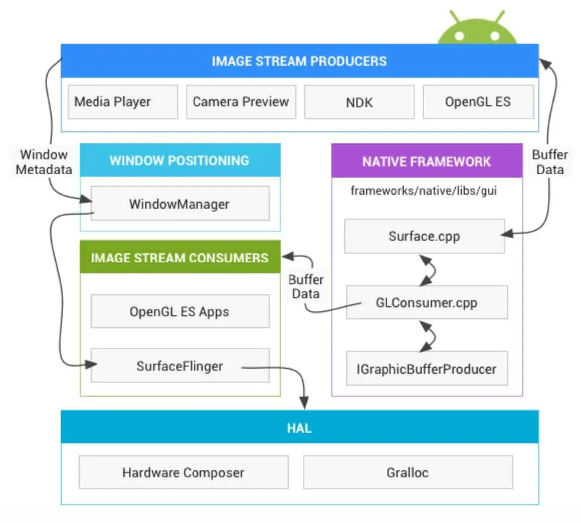 任何可以产生图形信息的组件都统称为图像的生产者,比如OpenGL ES, Canvas 2D, 和 媒体解码器等。