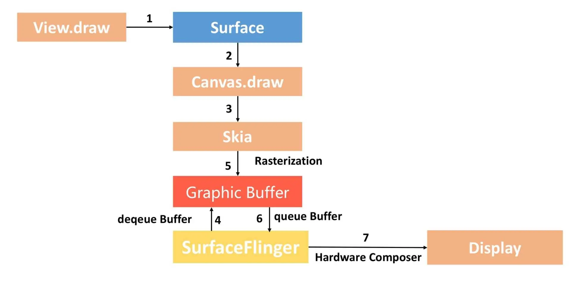- Graphic Buffer。SurfaceFlinger 会托管一个 BufferQueue,从 BufferQueue 中拿到 Graphic Buffer,然后通过 Canvas 和 Skia 将绘制内容栅格化到上面。