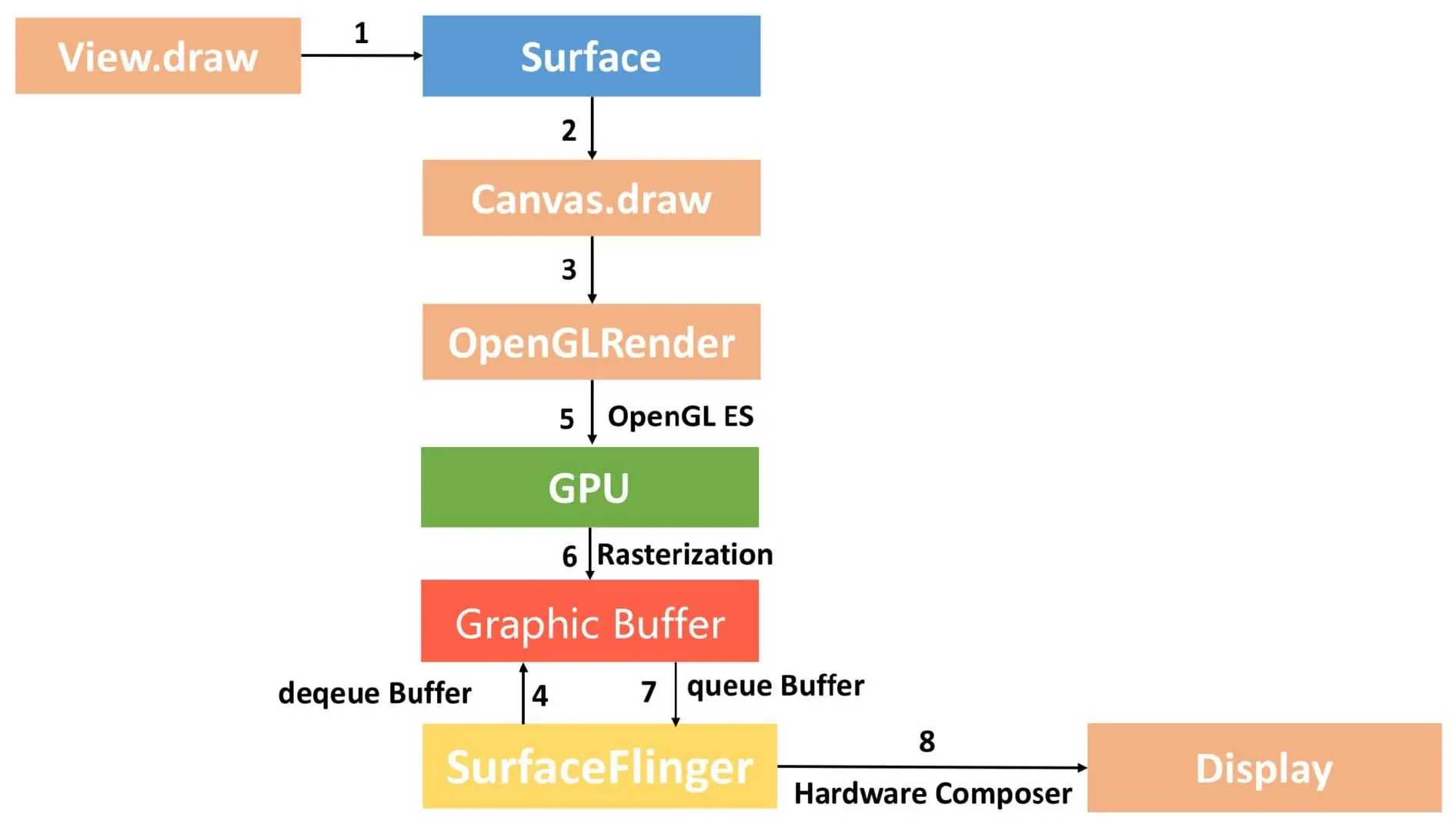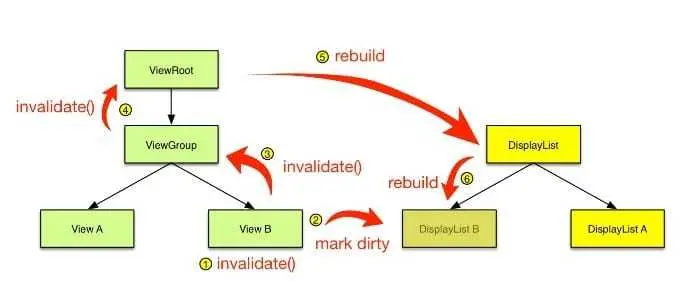 最核心的差别是,通过 GPU 完成 Graphic Buffer 的内容绘制。此外还映入了 DisplayList 的概念,每个 View 内部都有一个 DisplayList,当某个 View 需要重绘时,将它标记为 Dirty。