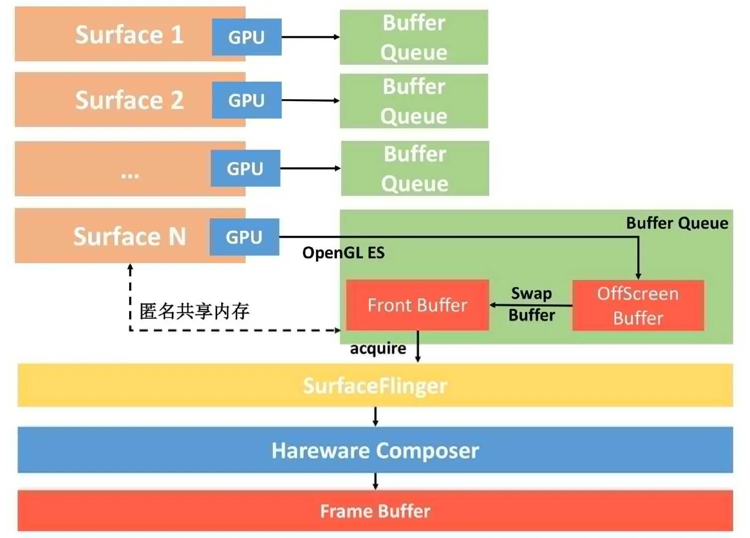 为硬件抽象层(HAL)的子系统。SurfaceFlinger可以将某些合成工作委托给Hardware Composer,从而减轻OpenGL和GPU的工作。此时,SurfaceFlinger扮演的是另一个OpenGL ES客户端,当SurfaceFlinger将一个缓冲区或两个缓冲区合成到第三个缓冲区时,它使用的是OpenGL ES。这种方式会比GPU更为高效。