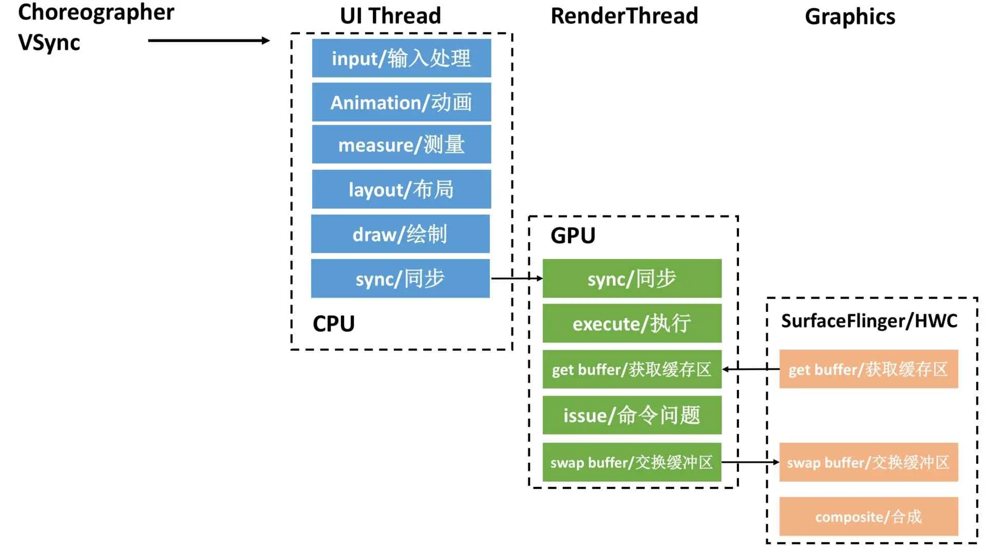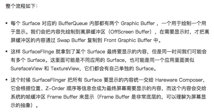 - SurfaceFlinger,通过 Swap Buffer 把 Front Graphic Buffer 的内容交给 SurfaceFinger,最后硬件合成器 Hardware Composer 合成并输出到显示屏。