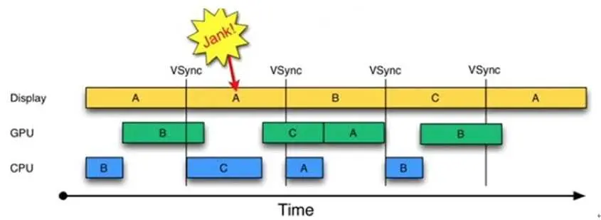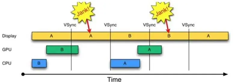 注意,当 VSync 信号发出时,如果 GPU/CPU 正在生产帧数据,此时不会发生复制操作。屏幕进入下一个刷新周期时,从 Frame Buffer 中取出的是“老”数据,而非正在产生的帧数据,即两个刷新周期显示的是同一帧数据。这是我们称发生了“掉帧”(Dropped Frame,Skipped Frame,Jank)现象。