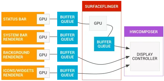 SurfaceFlinger是最常见的图像消费者,Window Manager将图形信息收集起来提供给SurfaceFlinger,SurfaceFlinger接受后经过合成再把图形信息传递给显示器。同时,SurfaceFlinger也是唯一一个能够改变显示器内容的服务。SurfaceFlinger使用OpenGL和Hardware Composer来生成surface. 某些OpenGL ES 应用同样也能够充当图像消费者,比如相机可以直接使用相机的预览界面图像流,一些非GL应用也可以是消费者,比如ImageReader 类。