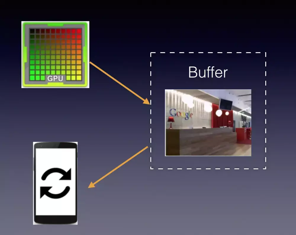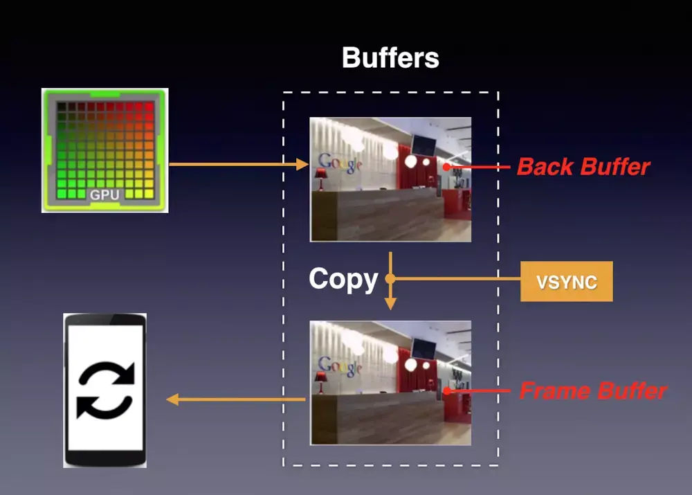 两个缓存区分别为 Back Buffer 和 Frame Buffer。GPU 向 Back Buffer 中写数据,屏幕从 Frame Buffer 中读数据。VSync 信号负责调度从 Back Buffer 到 Frame Buffer 的复制操作,可认为该复制操作在瞬间完成。