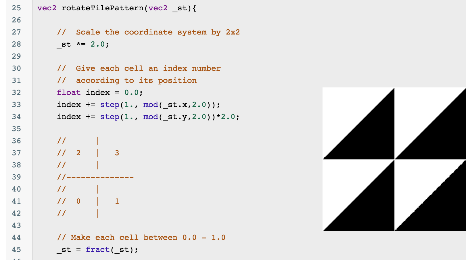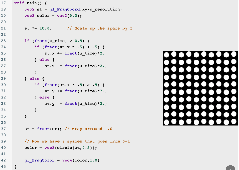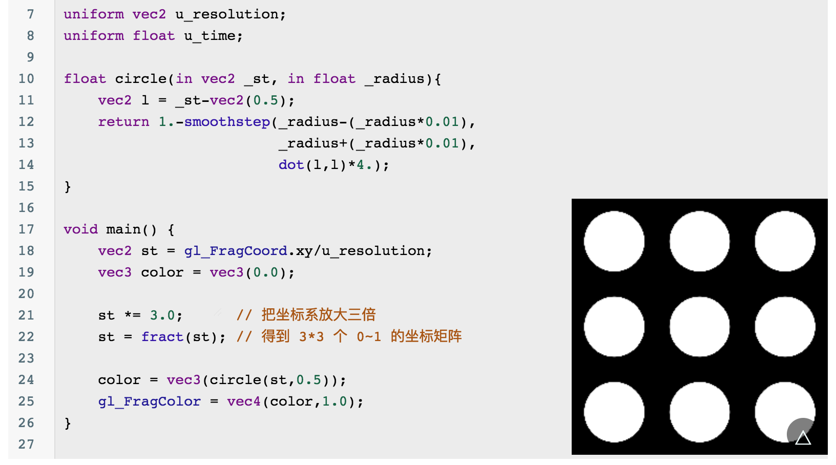 绘制 Pattern 图案并不需要在 0~1 坐标系内重复绘制,我们可以利用 fract() 这个函数来把放大后的坐标系拆分成若干个0~1的坐标系。