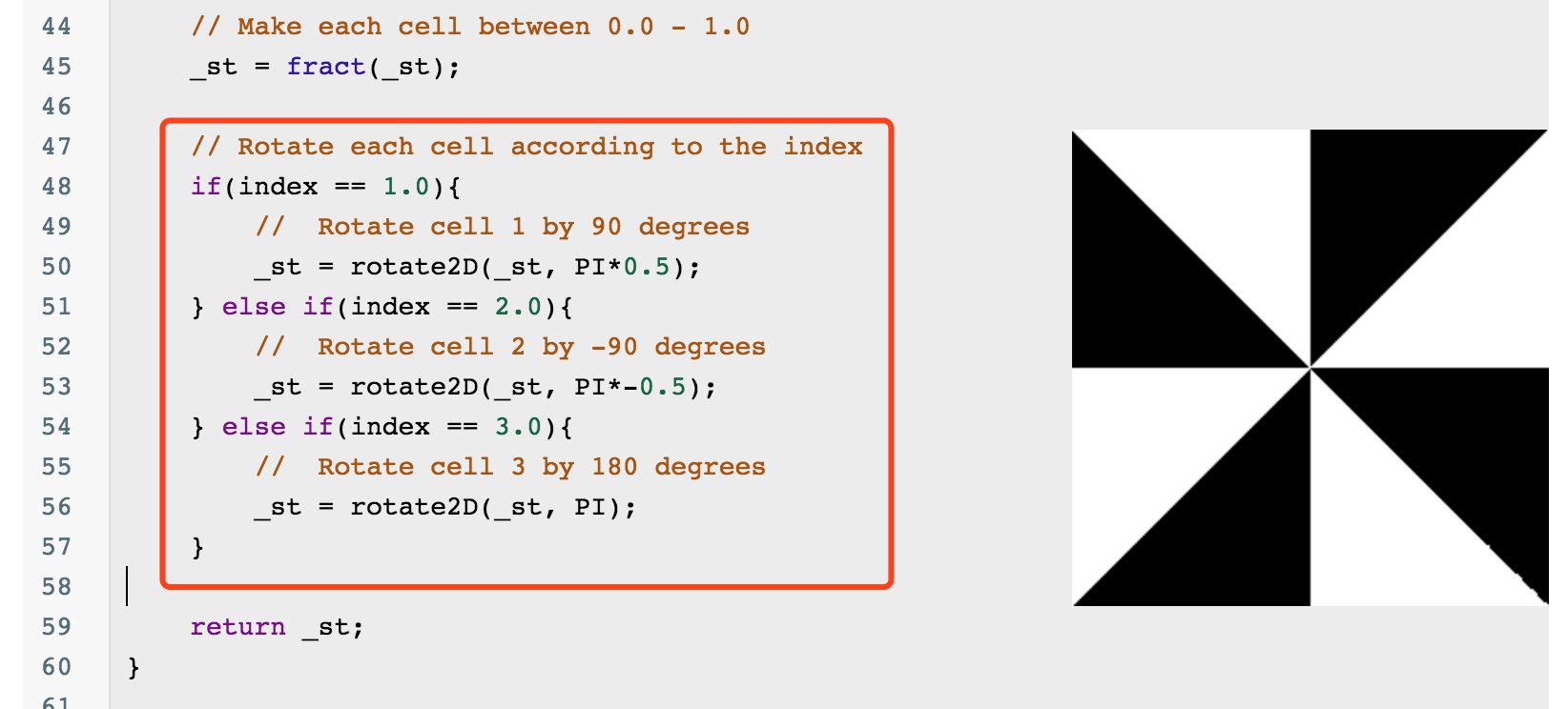 float a = atan(_st.x, _st.y) + PI;