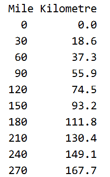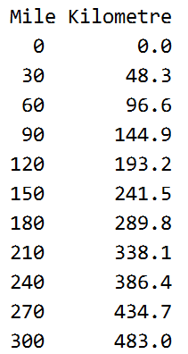 /* print Mile to Kilometre table*/